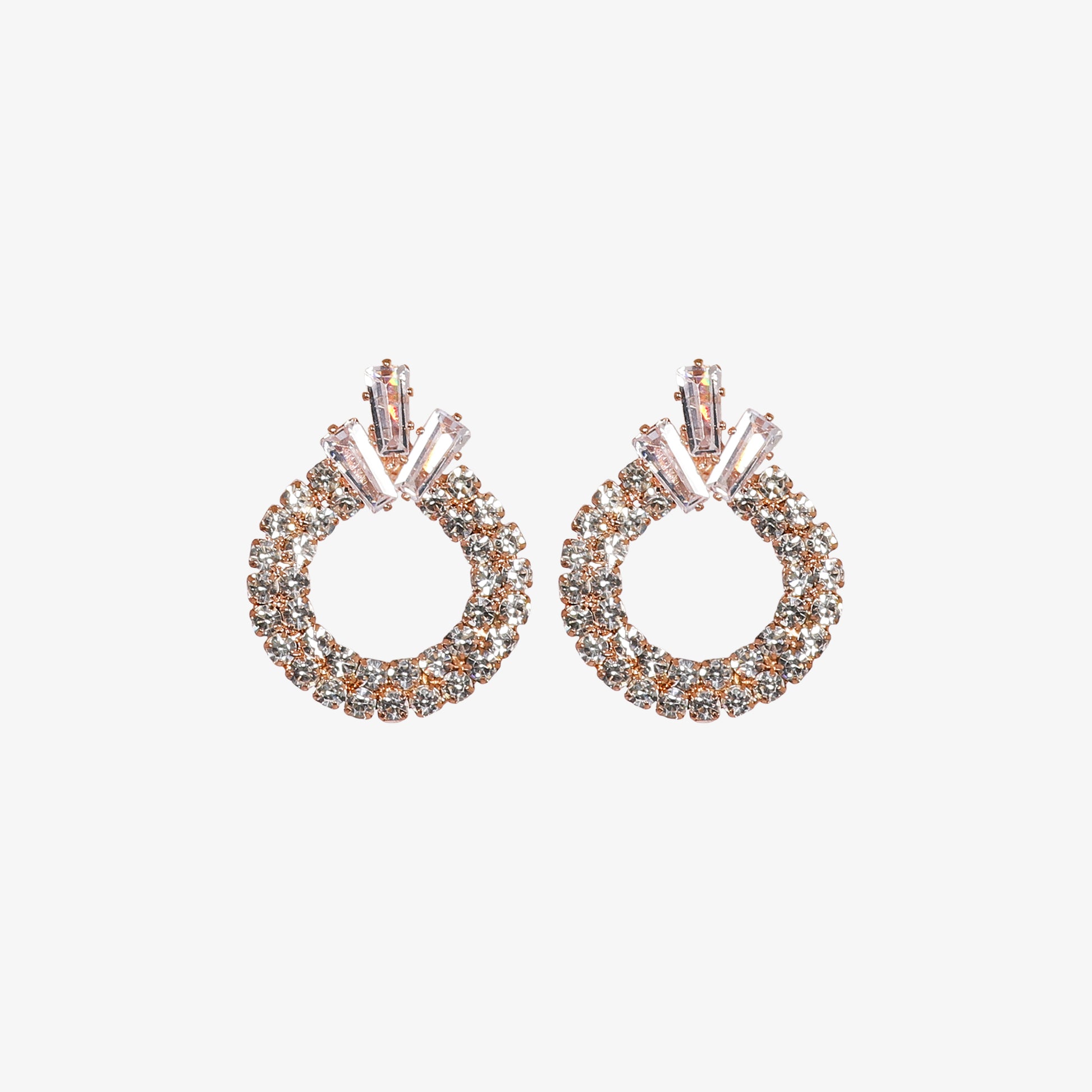 These stunning rose gold-tone earrings offer a radiant sparkle, perfect for elevating any look. Each earring features a graceful oval-shaped hoop entirely encrusted with brilliant, clear rhinestones, creating a continuous line of shimmer. At the top, a charming accent of baguette-cut rhinestones adds a touch of modern sophistication. Lightweight and eye-catching, these earrings are ideal for adding glamour to both day and evening wear.